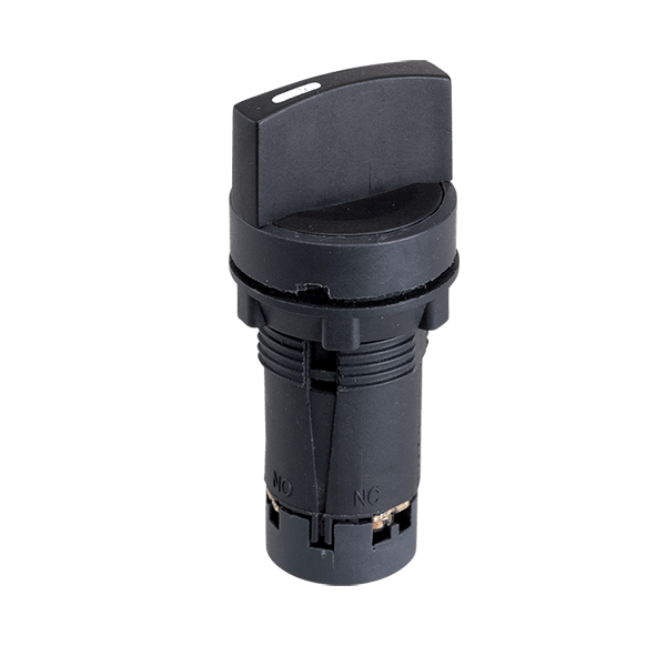Черен двупозиционен команден бутон с контакти 1NO+1NC. Подходящ за управление и превключване в електрически табла и индустриални системи.