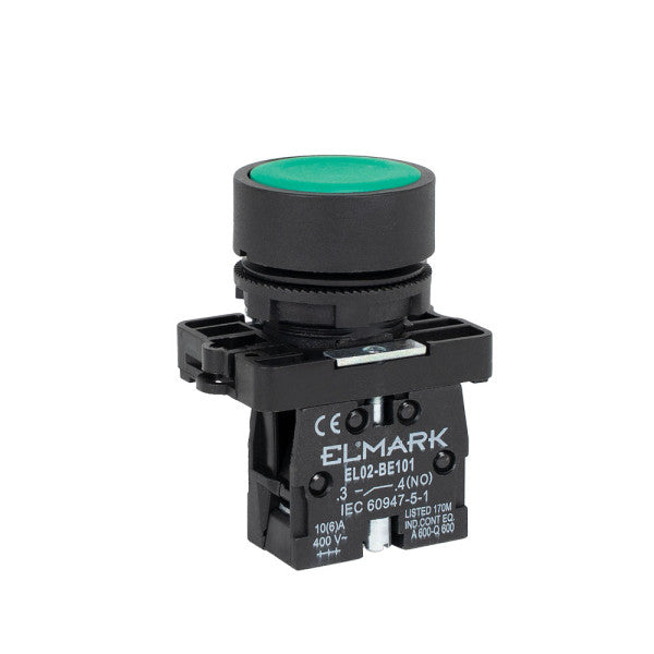 Зелен команден бутон с нормално отворен контакт (НО). Подходящ за електрически табла, машини и системи за управление.